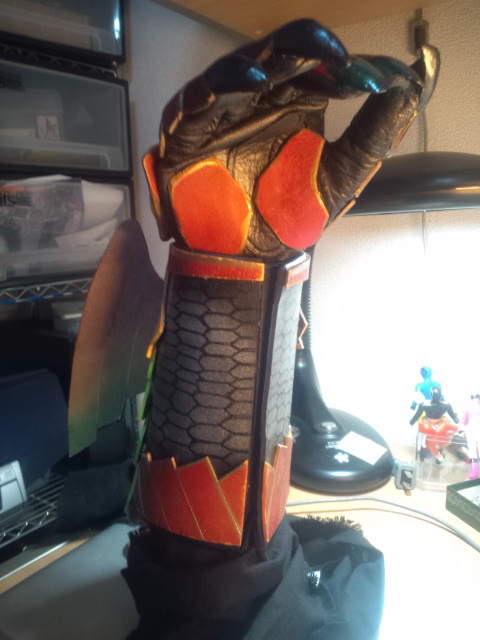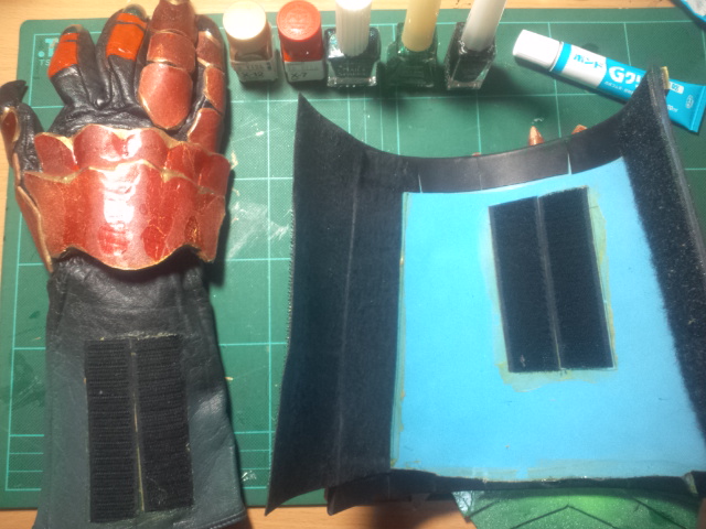 画像は今回活躍した塗料と、手袋&籠手の裏側です。