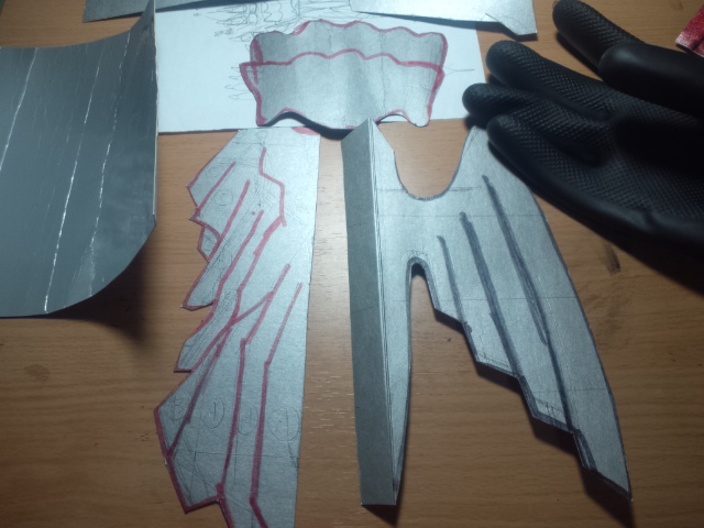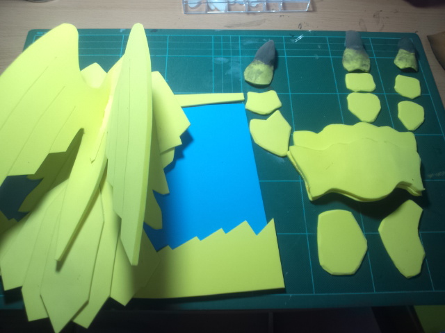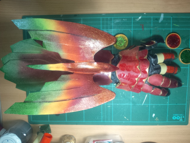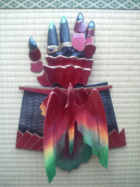 鱗部分はソフトボードに合皮を貼ってメタリックスプレーで塗装、鱗柄は細い筆ペンで書いています。